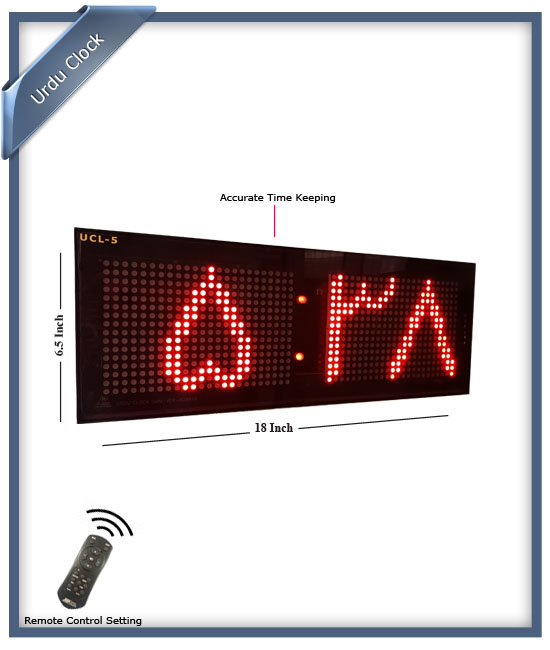 -> Setting through Remote Control-> Accurate Real Time Clock in Urdu-> Illuminated Digits well visible at night and from distance-> Internal battery cell to keep Date/Time remain updated even at power OFF